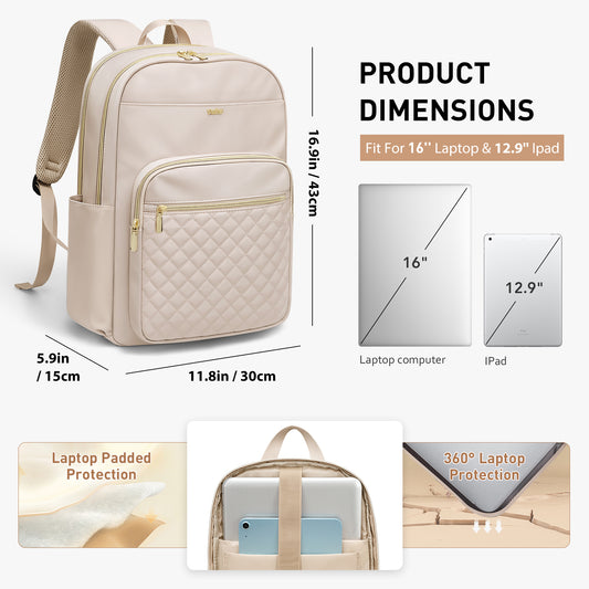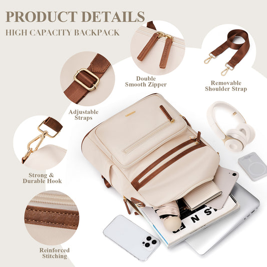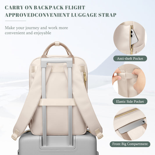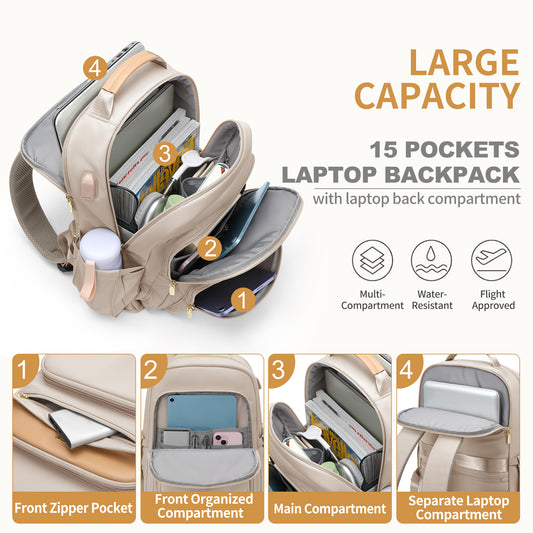 VNINE Laptop Backpack for Women Work: 15.6 Inch Computer Backpacks Purse Large Capacity Carry on Bookbag Waterproof Lightweight Daypack Bag for College Nurse Teacher Travel Beige